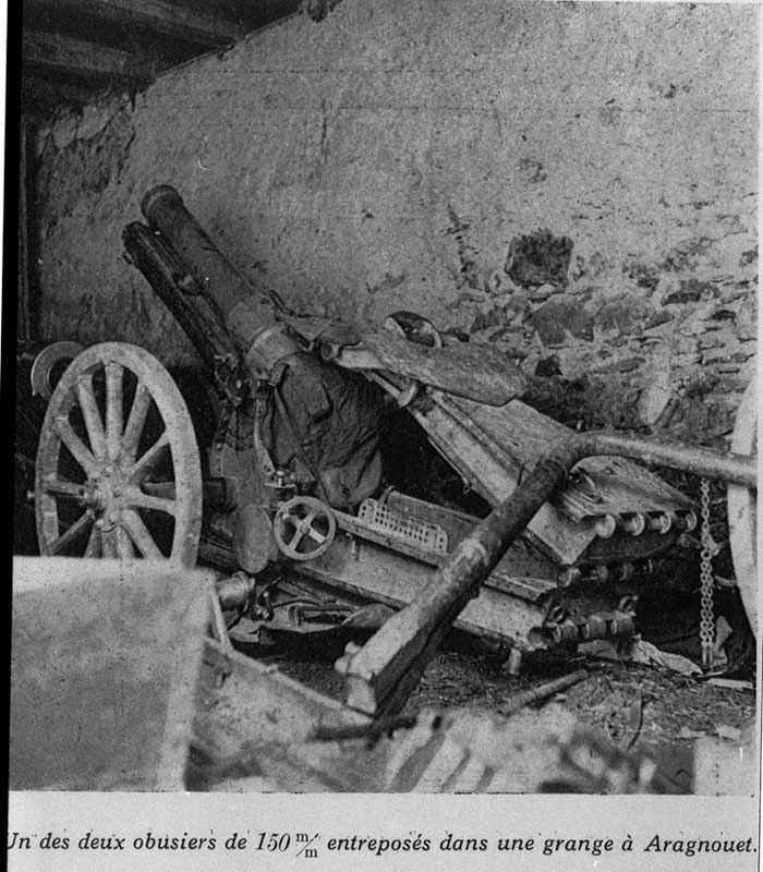 | Contenido: Fotografía publicada en el periódico francés L'Illustration el 2 de julio de 1938, en artículo titulado "Un episodio de la guerra de España. La evacuación de la 43 División". El pie de foto completo dice, traducido: "Uno de los dos cañones de 150 m/m almacenados en una granja de Aragnouet. |