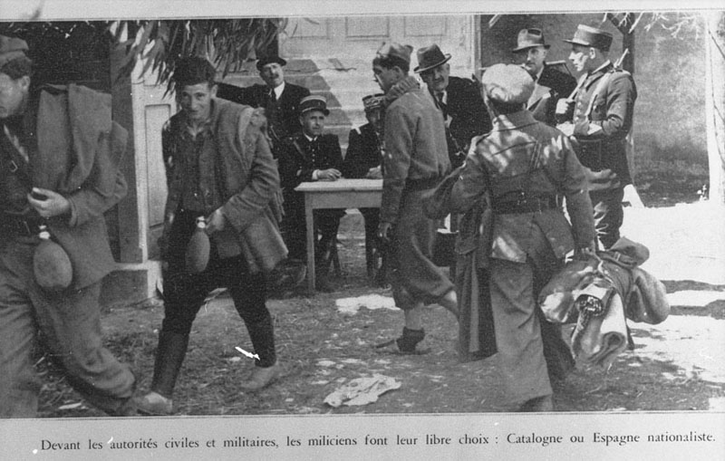 Contenido: Publicada en L'Illustration, nº 4962, 09-04-1938, p. 371. Bajo la imagen consta el siguiente pie de foto: "Ante las autoridades civiles y militares, los milicianos hacen su libre elección: Cataluña o la España nacionalista / Refugiados españoles civiles y militares en Luchon / Fotografías Keystone".