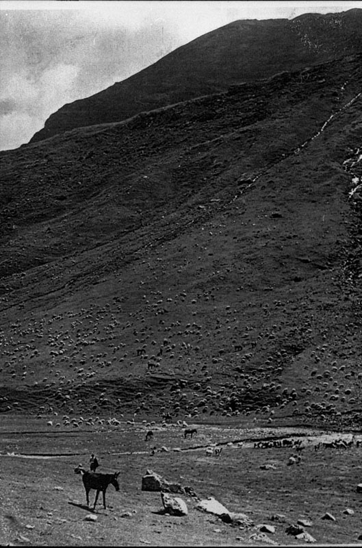 | Contenido: Fotografía publicada en el periódico francés L'Illustration el 2 de julio de 1938, en artículo titulado "Un episodio de la guerra de España. La evacuación de la 43 División". El pie de foto completo dice, traducido: "Los rebaños evacuados de España con la 43 División son llevados por la vertiente francesa de los Pirineos al valle de la Gela".