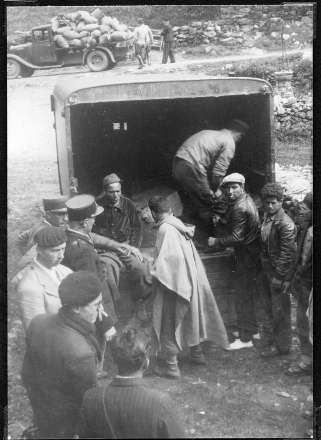 Contenido: Los milicianos heridos y algunos civiles eran transportados hasta Saint Lary o Arreau en camiones o ambulancias desde Fabian o Aragnouet, donde comenzaba la carretera. Esta imagen es de Aragnouet donde llegaban solo los camiones más pequeños. Grupo de tres imágenes casi idénticas tomadas con unos minutos de diferencia.