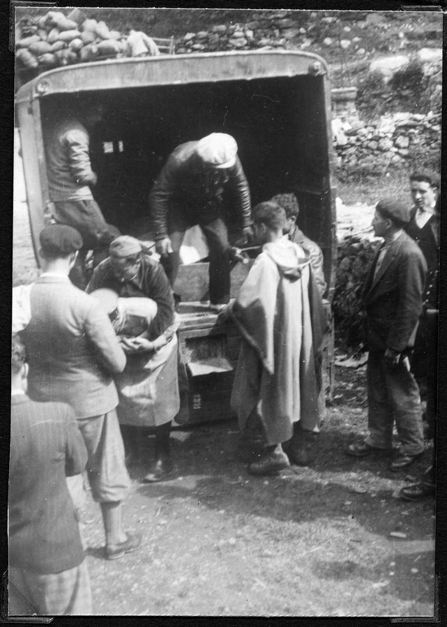 Contenido: Los milicianos heridos y algunos civiles eran transportados hasta Saint Lary o Arreau en camiones o ambulancias desde Fabian o Aragnouet, donde comenzaba la carretera. Esta imagen es de Aragnouet donde llegaban solo los camiones más pequeños. Grupo de tres imágenes casi idénticas tomadas con unos minutos de diferencia.