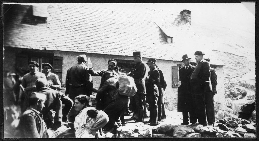 | Contenido: Imágenes de la atención a la población civil y a los soldados de la 43 DV en el Plan de Aragnouet. Como en las dos anteriores, en esta fotografía aparece a la derecha el secretario general de la C.G.T. (Confederación General del Trabajo) de Francia, Léon JOUHAUX (con bigote y boina) y otro dirigente de la misma organización. En esta primera parada son atendidos por voluntarios de la CGT y por la población francesa de los pueblos del valle. Están delante de casa de Justin PALUSTRAN en las casas de Chaubère del Plan de Aragnouet. |