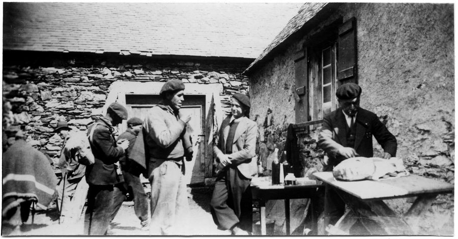 | Contenido: Imágenes de la atención a la población civil y a los soldados de la 43 DV en el Plan de Aragnouet. Como las anteriores, está tomada delante de casa de Justin PALUSTRAN en las casas de Chaubère del Plan de Aragnouet. La población civil y los soldados son atendidos por voluntarios de la CGT y por la población francesa de los pueblos del valle. Apoyado en la mesa con boina BEYRIE de Eget que aparece también en la imagen MB-003-020-000-006. |