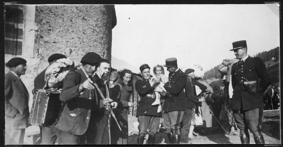 | Contenido: Dos imágenes de la atención a la población civil que llega desde los pueblos de la bolsa de Bielsa delante de la iglesia de Aragnouet. Según las notas de Joseph Verdier del 3 al 18 de abril entraron en el valle del Aure más de 4.000 refugiados civiles. El recorrido habitual era pasar por el Puerto Viejo, bajando después el valle de la Gèla hasta el Plan y la iglesia de Aragnouet donde eran atendidos por gendarmes y voluntarios franceses. Con uniforme los gendarmes de la guardia móvil. |