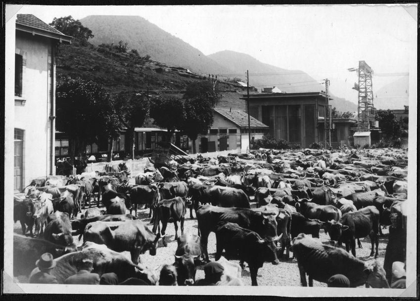 | Contenido: En ganado procedente de la bolsa de Bielsa es embarcado en trenes en la estación de Arreau para devolverlo a zona republicana vía Barcelona. Según las notas de Joseph Verdier, el 21 de junio de 1938, en un artículo de prensa, se informa que los servicios veterinarios del estado francés han inspeccionado: 2.182 bovinos, 15.630 ovinos y 250 caballerías. En esta imagen un gran rebaño de vacas delante de las vías del tren en el recinto de la estación. |