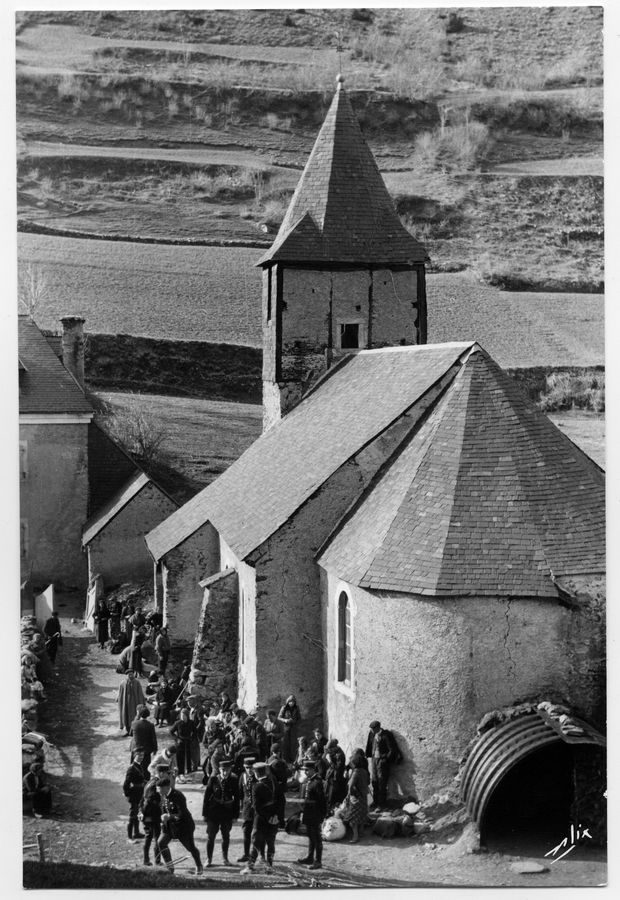 Contenido: Refugiados y gendarmes en la iglesia de Aragnouet. Según las notas de Joseph Verdier del 3 al 18 de abril entraron en el valle del Aure más de 4.000 refugiados civiles. En la nota manuscrita que acompaña la imagen, Joseph Verdier describe el recorrido realizado por la población civil: Después del Puerto Viejo, el valle de la Gèla hasta la etapa de la iglesia de Aragnouet. Grupo de imágenes recopiladas por Joseph Verdier para acompañar sus estudios sobre la bolsa de Bielsa, la mayor parte realizadas por los fotógrafos desplazados por los medios de prensa escrita, más un grupo de imágenes adquiridas al fotógrafo Alix de Bagneras de Bigorre. |