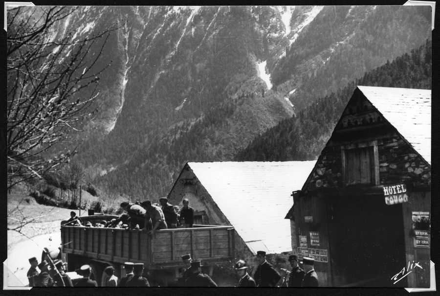 Contenido: Después de una parada en el hotel Fouga, en Fabian, los heridos y algunos civiles eran transportados hasta Arreau en camiones. La carretera llegaba en esta época hasta Fabian. Los gendarmes y oficiales de aduanas contralaban el proceso.