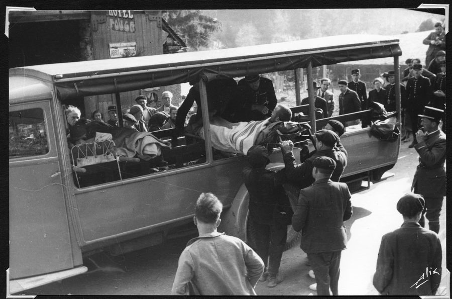 Contenido: Después de una parada en el hotel Fouga en Fabian, los soldados heridos son transladados hasta Arreau. En esta imagen los heridos son subidos a una ambulancia prestada por el obispado de Tarbes procedente de Lourdes. De este momento hay varias imágenes en el grupo de ALIX. Los gendarmes y responsables de Aduanas vigilan el traslado. La carretera llegaba en esta época hasta Fabian. Grupo de imágenes recopiladas por Joseph Verdier para acompañar sus estudios sobre la bolsa de Bielsa, la mayor parte realizadas por los fotógrafos desplazados por los medios de prensa escrita, más un grupo de imágenes adquiridas al fotógrafo Alix de Bagneras de Bigorre. |