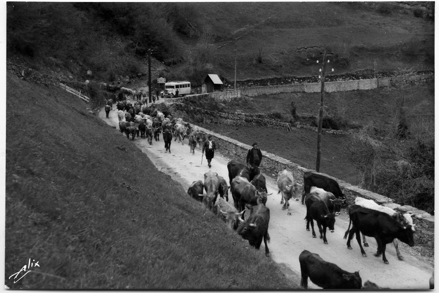 Contenido: Grupo de imágenes de la entrada en el valle del Aure de ganado procedente de la bolsa de Bielsa. Según las notas de Joseph Verdier, el 21 de junio de 1938, en un artículo de prensa, se informa que los servicios veterinarios del estado francés han inspeccionado: 2.182 bovinos, 15.630 ovinos y 250 caballerías. Alix fotografió el traslado de un gran rebaño de ganado bovino desde Tramezaïgues hasta Arreau, el control veterinario y su paso por las poblaciones. En esta imagen el rebaño sale del desvío de Tramezaïgues para incorporarse a la carretera de Arreau.