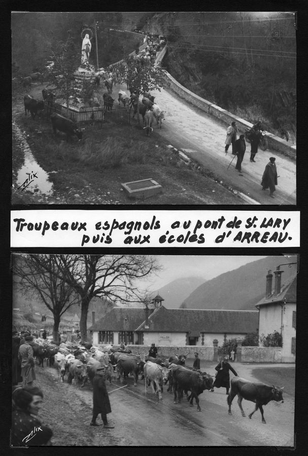 Contenido: Grupo de imágenes de la entrada en el valle del Aure de ganado procedente de la bolsa de Bielsa. Según las notas de Joseph Verdier, el 21 de junio de 1938, en un artículo de prensa, se informa que los servicios veterinarios del estado francés han inspeccionado: 2.182 bovinos, 15.630 ovinos y 250 caballerías. Alix fotografió el traslado de un gran rebaño de ganado bovino desde Tramezaïgues hasta Arreau, el control veterinario y su paso por las poblaciones. En el texto manuscrito de Joseph Verdier: Rebaños españoles en el puente de Saint-Lary, después en las escuelas de Arreau. |