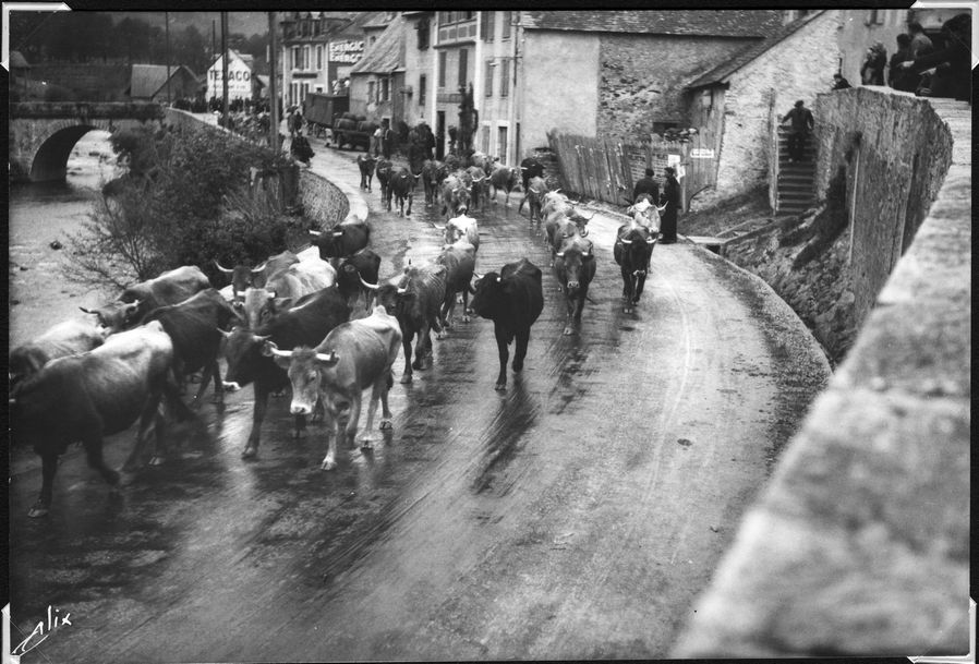 Contenido: Grupo de imágenes de la entrada en el valle del Aure de ganado procedente de la bolsa de Bielsa. Según las notas de Joseph Verdier, el 21 de junio de 1938, en un artículo de prensa, se informa que los servicios veterinarios del estado francés han inspeccionado: 2.182 bovinos, 15.630 ovinos y 250 caballerías. Alix fotografió el traslado de un gran rebaño de ganado bovino desde Tramezaïgues hasta Arreau, el control veterinario y su paso por las poblaciones. En esta imagen el rebaño en Arreau camino de la estación de tren de esta localidad donde eran embarcados en trenes para regresar a España por Cataluña en zona republicana. Grupo de imágenes recopiladas por Joseph Verdier para acompañar sus estudios sobre la bolsa de Bielsa, la mayor parte realizadas por los fotógrafos desplazados por los medios de prensa escrita, más un grupo de imágenes adquiridas al fotógrafo Alix de Bagneras de Bigorre. |