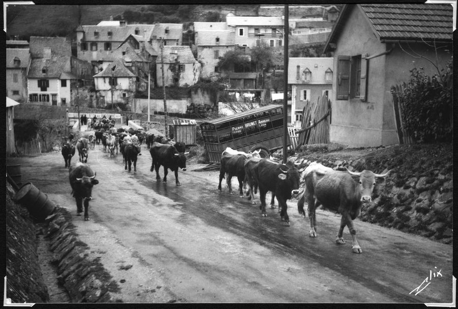 Contenido: Grupo de imágenes de la entrada en el valle del Aure de ganado procedente de la bolsa de Bielsa. Según las notas de Joseph Verdier, el 21 de junio de 1938, en un artículo de prensa, se informa que los servicios veterinarios del estado francés han inspeccionado: 2.182 bovinos, 15.630 ovinos y 250 caballerías. Alix fotografió el traslado de un gran rebaño de ganado bovino desde Tramezaïgues hasta Arreau, el control veterinario y su paso por las poblaciones. En esta imagen el rebaño en Arreau camino de la estación de tren de esta localidad donde eran embarcados en trenes para regresar a España por Cataluña en zona republicana. Grupo de imágenes recopiladas por Joseph Verdier para acompañar sus estudios sobre la bolsa de Bielsa, la mayor parte realizadas por los fotógrafos desplazados por los medios de prensa escrita, más un grupo de imágenes adquiridas al fotógrafo Alix de Bagneras de Bigorre. |