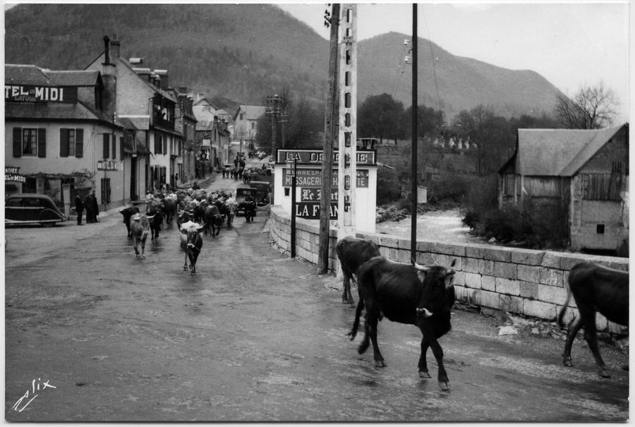 Contenido: Grupo de imágenes de la entrada en el valle del Aure de ganado procedente de la bolsa de Bielsa. Según las notas de Joseph Verdier, el 21 de junio de 1938, en un artículo de prensa, se informa que los servicios veterinarios del estado francés han inspeccionado: 2.182 bovinos, 15.630 ovinos y 250 caballerías. Alix fotografió el traslado de un gran rebaño de ganado bovino desde Tramezaïgues hasta Arreau, el control veterinario y su paso por las poblaciones. En esta imagen el rebaño en Arreau camino de la estación de tren de esta localidad donde eran embarcados en trenes para regresar a España por Cataluña en zona republicana. Grupo de imágenes recopiladas por Joseph Verdier para acompañar sus estudios sobre la bolsa de Bielsa, la mayor parte realizadas por los fotógrafos desplazados por los medios de prensa escrita, más un grupo de imágenes adquiridas al fotógrafo Alix de Bagneras de Bigorre. |