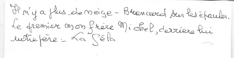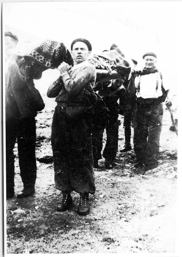 Contenido: Grupo de 5 fotografías tomadas en el valle de la Gèla en Francia en las que aparecen Michel Castells y sus hijos actuando como voluntarios ayudando a pasar el puerto a los milicianos heridos y a la población civil en la retirada de la 43 DV durante la bolsa de Bielsa. Traducción de la nota del reverso: Ya no queda nieve. Camilla sobre los hombros. El primero mi hermano Michel, detrás de él nuestro padre. La Gèla. |