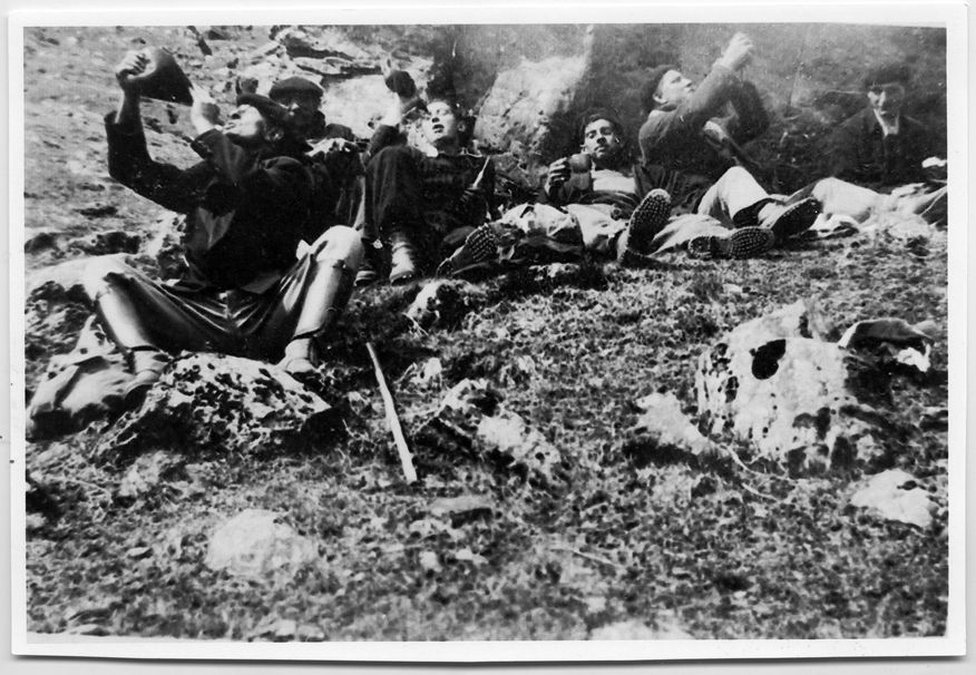 Contenido: Grupo de 5 fotografías tomadas en el valle de la Gèla en Francia en las que aparecen Michel Castells y sus hijos actuando como voluntarios ayudando a pasar el puerto a los milicianos heridos y a la población civil en la retirada de la 43 DV durante la bolsa de Bielsa. Traducción de la nota del reverso: La postura. En el centro bebiendo en bota Michel Castells, mi padre, a su derecha tumbado, mi hermano Henri. La Gèla. |