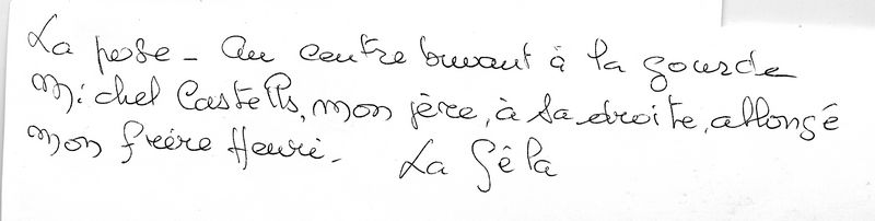 Nota: La familia Castells de Tarbes eran trabajadores y estaban afiliados al sindicato C.G.T. (Confederación General del Trabajo) de Francia, como muchos franceses de izquierdas de la época, actuaron como voluntarios para ayudar a los refugiados españoles del bando republicano. Grupo de 5 fotografías donadas por la familia Castells a Joseph Verdier. Forman parte del grupo de imágenes recopiladas por él para documentar sus estudios sobre la bolsa de Bielsa. Todas tienen una nota en el reverso. |
