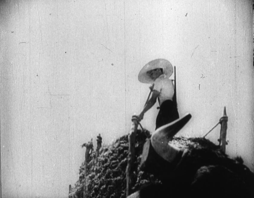 | Contenido: Detalle de la fotografía anterior, un campesino con el fusil al hombro sobre carro de cereal. |