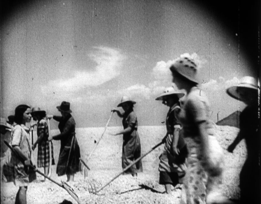 | Contenido: Grupo de mujeres de un pueblo de Aragón trabajando en la recogida del cereal, una niña ayuda en las tareas. |