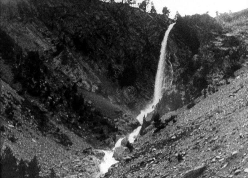 En la locución se ensalza a los héroes de la 43 división que han evacuado sus posiciones sin perder armas ni caballerías y que después de dejarlas en Francia han elegido continuar su lucha por la República volviendo a entrar en España por Cataluña. Imagen del inicio del documental que corresponde a la cascada del camino del Puerto de Bielsa. |