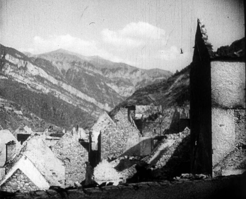 | Contenido: Título Noticia: Valle de Bielsa. El documental presenta imágenes de varios poblaciones en ruinas y de grupos de población civil, se distinguen claramente Bielsa, Escalona y tal vez Plan. En la locución habla del saqueo y destrucción de las tropas de la célebre división roja nº 43 en su huida a Francia durante la bolsa de Bielsa.