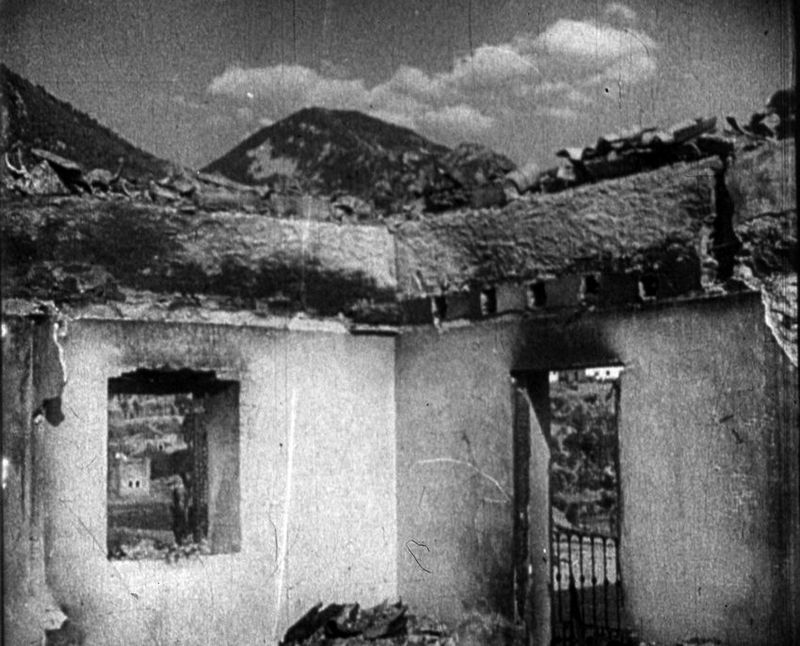 | Contenido: Título Noticia: Valle de Bielsa. El documental presenta imágenes de varios poblaciones en ruinas y de grupos de población civil, se distinguen claramente Bielsa, Escalona y tal vez Plan. En la locución habla del saqueo y destrucción de las tropas de la célebre división roja nº 43 en su huida a Francia durante la bolsa de Bielsa. Casa destruida, tal vez en Parzán. |