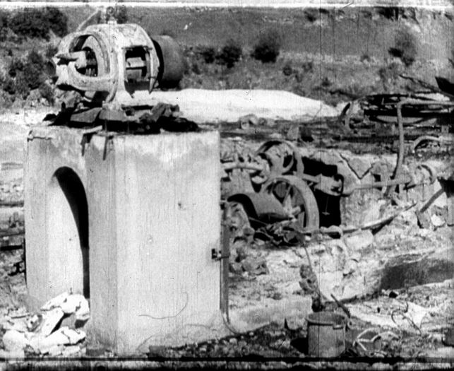 | Contenido: Título Noticia: Valle de Bielsa. El documental presenta imágenes de varios poblaciones en ruinas y de grupos de población civil, se distinguen claramente Bielsa, Escalona y tal vez Plan. En la locución habla del saqueo y destrucción de las tropas de la célebre división roja nº 43 en su huida a Francia durante la bolsa de Bielsa. Maquinaria del molino de Bielsa. |