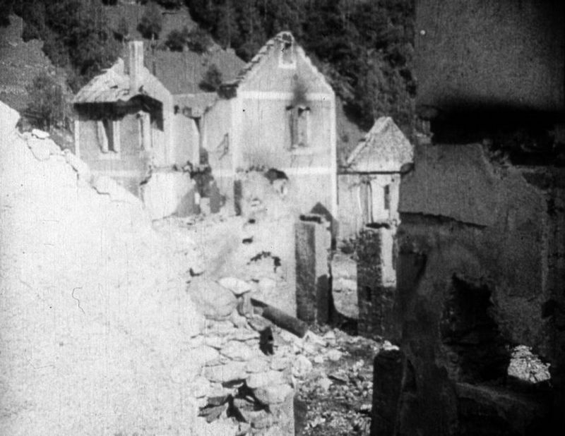 | Contenido: Título Noticia: Valle de Bielsa. El documental presenta imágenes de varios poblaciones en ruinas y de grupos de población civil, se distinguen claramente Bielsa, Escalona y tal vez Plan. En la locución habla del saqueo y destrucción de las tropas de la célebre división roja nº 43 en su huida a Francia durante la bolsa de Bielsa. Imagen de Bielsa, detalle de varias casas. |