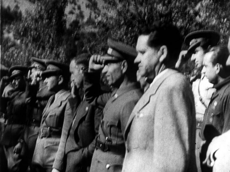Contenido: Imagen del documento de la serie Vascongadas referente a la visita de Manuel Irujo, ministro de la república, a la 43 división. Partiendo desde Fabian en Francia, pasa al valle de Bielsa por el puerto, para encontrarse con Antonio Beltrán y el resto de oficiales de la división. Soldados de la división desfilan delante de Manuel Irujo, Antonio Beltrán y oficiales. Según GASCÓN RICAO, Antonio. La Bolsa de Bielsa: el heroico final de la república en Aragón, Huesca, DPH y Museo de Bielsa, 2005, la visita de Manuel Irujo a la bolsa de Bielsa se produjo el 6 de junio de 1938. |