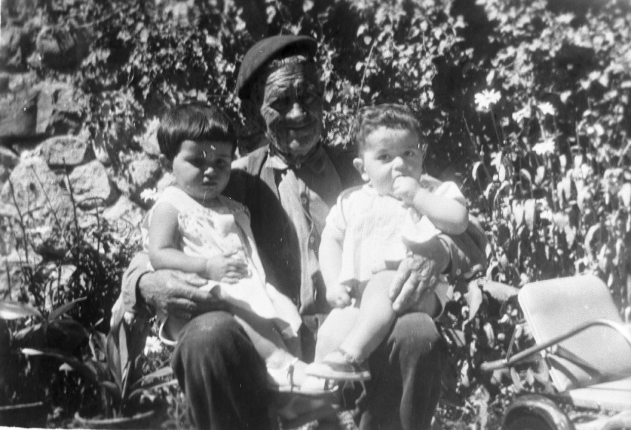 | Contenido: En el corral de casa Alonso, Petro Pañart Gistau, de casa Alonso, con los niños María Nieves Pañart Dueso (Alonso), a la izquierda, y Luis Noguero Pañart, de casa Moliner. |
