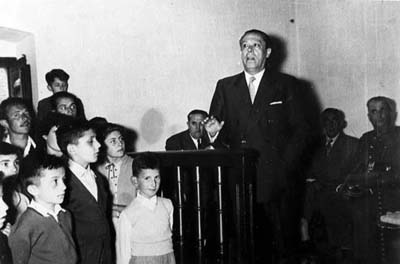 | Contenido: Fotografía correspondiente al reportaje realizado con motivo de la inauguración de la serrería. El gobernador civil Gil Sastre interviene ante el público congregado en dependencias municipales. |