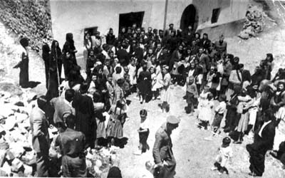 | Contenido: Grupo de gente ante casa Julio, donde se celebraba misa recién terminada la guerra hasta que fue reconstruida la iglesia. La ceremonia que se celebra es la boda de José María Escalona Vidallé. |