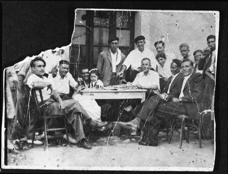 De pie, de derecha a izquierda: dos desconocidos, José Martín de Antonio (de casa Clareta), Fulgencio Pañart Pañart (de casa Fuli), Pascual Irigaray Escalona (de casa Irigaray), Luis Martín de Antonio (de casa Clareta), Pedro Lamuga Barta (de casa Francho), Jesús Irigaray Escalona (de casa Irigaray) y Juan Bernad Zueras (de casa Matoso de Parzán). |