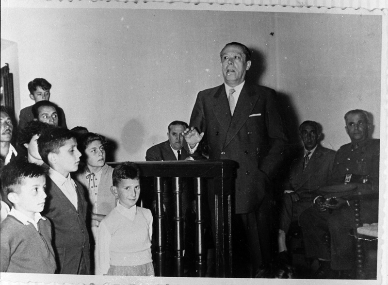 | Contenido: Intervención del gobernador civil de Huesca, Ernesto Gil Sastre, en el salón de actos del ayuntamiento antes de proceder a la inauguración de la serrería. |