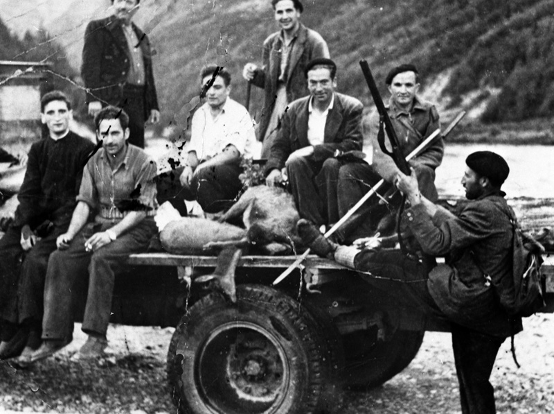 Sentados, de izquierda a derecha: Antonio Méliz Méliz, Paco Méliz Méliz, José Bielsa Ferrer, de casa Pochas, Jesús Fantova, Casimiro Vega Colinos (con la escopeta) y Domiciano Simal (de espaldas).