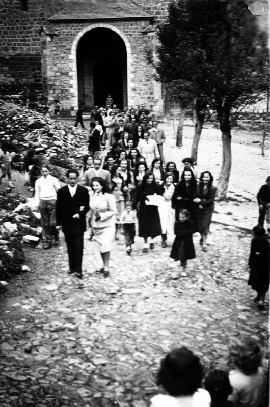 Contenido: Se trata de la boda de Paco Méliz Méliz y Raquel Sanz Buil. Además de los novios, han podido identificarse a las siguientes personas de la primera fila: