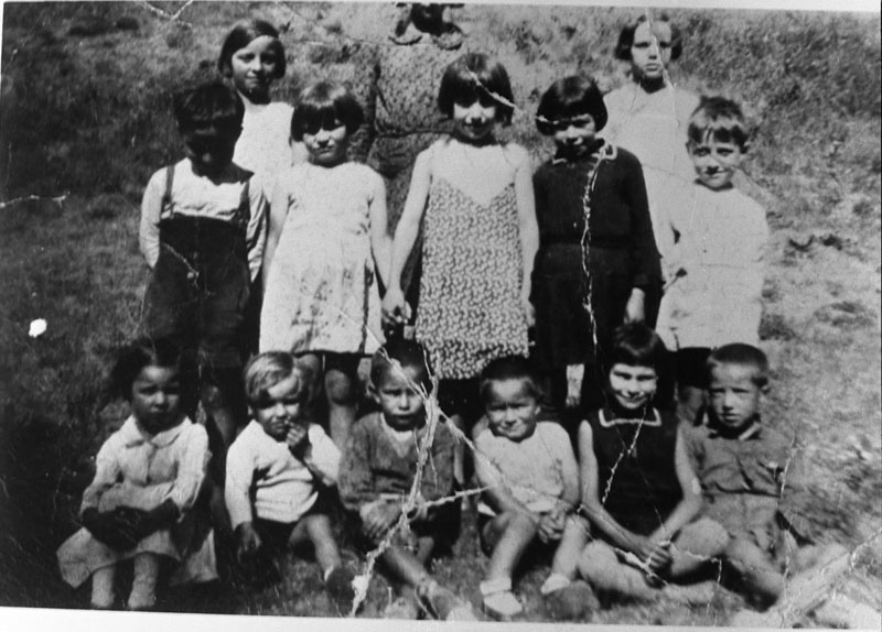 | Contenido: Los niños retratados son: Pilar Dueso Martín, de casa La Miñona, Antonio Dueso Martín, de casa La Miñona, Antonio Ortáriz Casasnovas, de casa Ortáriz, José Bielsa Ferrer, de casa Pochas, Teresa Ortáriz Casasnovas, de casa Ortáriz, Rafael Irigoyen Bernad, de casa Raspa, Alberto Burrugorri Comps, Nieves Dueso Martín, de casa La Miñona (detrás), Dolores Ortáriz Casasnovas, de casa Ortáriz, Ascensión Irigoyen Bernad, de casa Tozalo, Irene Bielsa Ferrer, de casa Pochas, José de Mur Comps, de casa Siso, María Bielsa Ferrer, de casa Pochas (detrás), y Petra Dueso Martín, de casa La Miñona. |