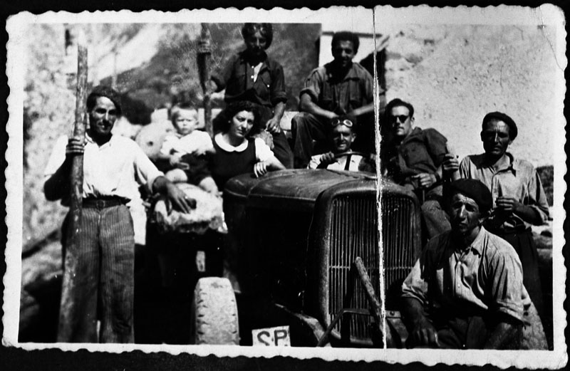 | Contenido: A la izquierda, Juan Gistau, serrador. La mujer es Marieta Patiño. Arriba, Mateo Saludas Bernad, de casa Plañera, y José Irigoyen Bernad, de casa Tozalo. Conduciendo, José Ortáriz de Antonio, de casa Ortáriz. Al lado, Luis Escalona Noguero, de casa Campo. Al lado, Antonio Noguero Solans, de casa Pichón. Debajo, a la derecha, Nicolás Barta, de casa Justa. |