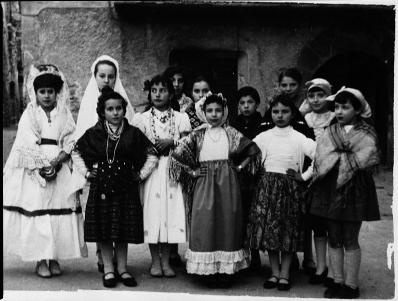 | Contenido: Fotografía tomada durante un baile de la Sección Femenina. Entre las niñas se encuentra Ana Mª Martínez de Mur, de casa Arturo, Marisa García Mur, de casa Elena, Mª Ángeles Escalona Gistau, de casa Sastremajo, Mª Nieves Guerrero Martínez, de casa Eulalia, Pili Rodríguez Dueso, de casa Iban, Carmen Rey Zueras, de casa Rey. Abajo: Mª Rosa Escalona Estévez, de casa Pepa, Mª Conchi Mazcaray Palacín, Mª Jesús García Mur,de casa Elena, Mª Jesús Fantova, de casa Forestal y Mª José Berastegui Baquer, de casa Serafina. |