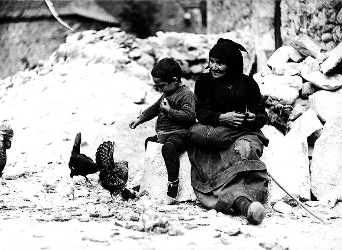 | Título: Abuela y nieto dando de comer a las gallinas |