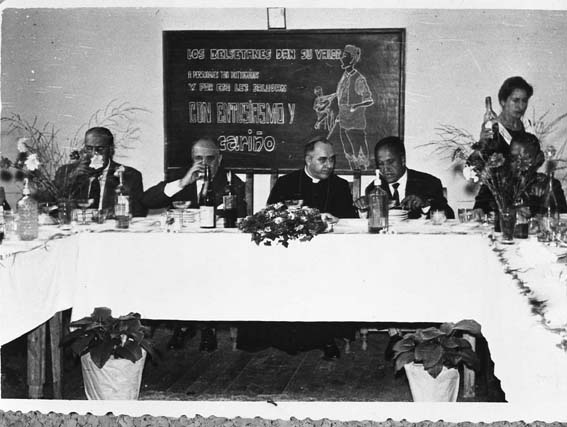 | Contenido: En la mesa que presidió la comida, en el centro, el obispo Cantero Cuadrado y Roque. Ana Méliz es la que sirve la mesa. |