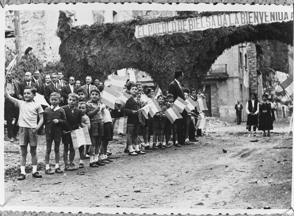 | Contenido: Recoge el momento en que ya se aproximan las autoridades. Los niños de la escuela se dispusieron a un lado de la arcada con el maesto, Joaquín Riazuelo, y al otro lado, las niñas con la maestra. Entre los niños se ha identificado a Angelito Galán y Fernando Roy. Detrás de ellos está Agustín (administrador), el forestal Jesús Fantova, don Antonio, Antonio Mazcaray y Joaquín Gómez. Al fondo, a la dereha, José Mur (Monclús) y María Ángeles Escalona, preparados para hablar con el obispo. |