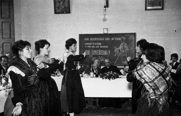 | Contenido: Teniendo como fondo la mesa presidencial, aparecen bailando Pilar y Ana Méliz, Pilar Mur, Loli Vidaller, M. C. García y Margarita Casasnovas. El baile se debió realizar en la sobremesa. |