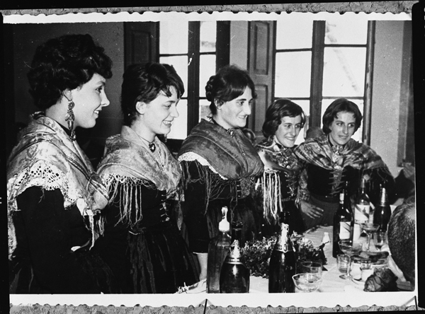 | Contenido: Las intérpretes del baile ante la mesa presidencial hablando con el obispo. son M. C. García, Loli Vidaller, Pilar Mur, Ana Gistau y Pilar Gistau. |