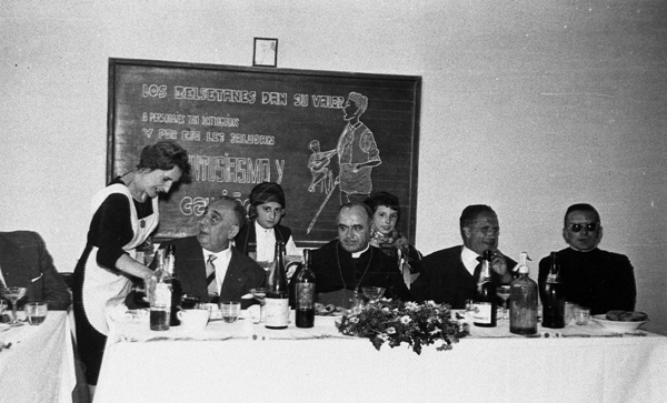 | Contenido: La mujer que sirve la mesa es Ana Méliz; los niños, María Ángeles Escalona y un chico de casa Monclús, José Mur. Los comensales son Cantero Cuadrado y un representante del Gobierno Civil, en el centro, y a los lados Roque (alcalde) y J. A. Lalueza (sacerdote). |
