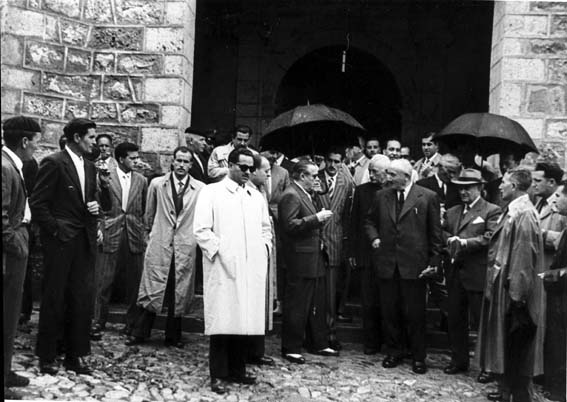 | Contenido: En el centro, el gobernador Gil Sastre y el alcalde Antonio Mazcaray; detrás de estos, en segundo término, Ramón (con traje a rayas) y José Méliz, ambos miembros de la corporación municipal. Entre el resto de los congregados se identifica, en segundo plano, con gabardina y bigote, a José María Escalona Vidallé. |
