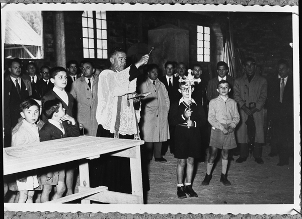 | Contenido: El sacerdote José Sampietro, con el hisopo en alto, realiza la bendición. Quinito Mur es el que lleva la cruz. A la izquierda, también oficiando como monaguillos, Roquito y Enrique de Mur (Galán). |