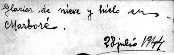 | Contenido: En reverso: "Glaciar de nieve y hielo en Marboré. 28, julio, 1944", en reverso; en anverso, "Glaciar de nieve y hielo". |