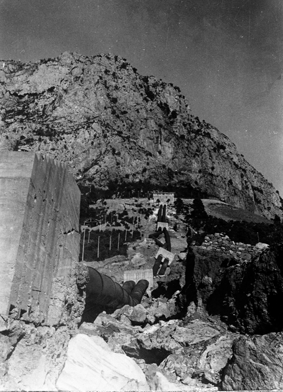 | Contenido: La fotografía recoge el salto de agua en Lafortunada del caudal del canal del Cinca, procedente del embalse de Pineta.\r\nSe construyó entre la segunda mitad de 1921 y 1922, en que entra en funcionamiento. En un informe del ingeniero Juan de Urrutia, fechado el 31 de mayo de 1921, se indica que estaba hecha la explanación para la colocación de la tubería y se anuncia el inicio de la construcción de la estructura superior de cemento armado. Calcula que la conducción puede estar en condiciones de funcionamiento en un año a partir de esa fecha. |