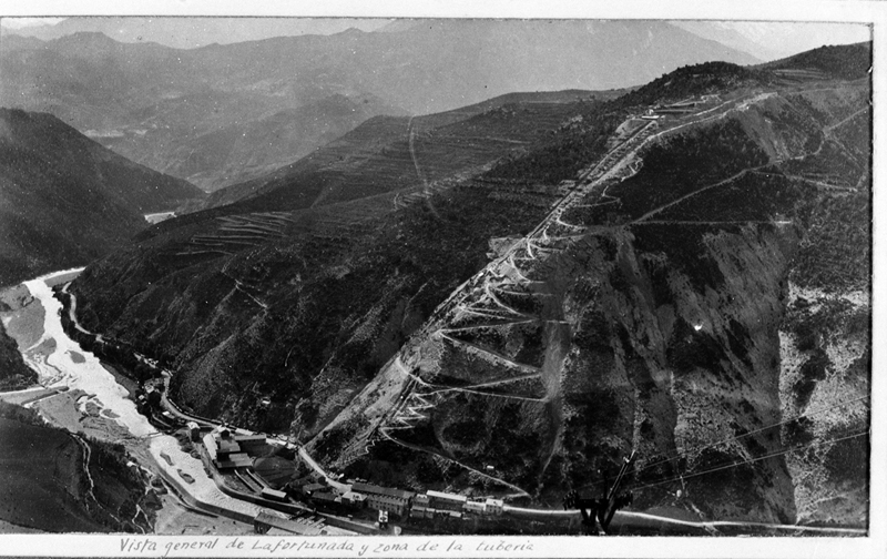 | Contenido: Vista aérea de Lafortunada y, especialmente, de la ladera donde se está construyendo la conducción forzada para el salto de agua procedente del canal del Cinca. Realizada en un momento en que ha finalizado la preparación del terreno y está pendiente la instalación de raíles en el plano inclinado para dar comienzo a las obras propiamente dichas. Coincide con la descripción del estado de las obras realizado por el ingeniero Juan Urrutia en informe de 31 de mayo de 1921. |