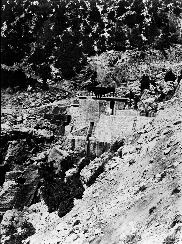 | Contenido: La fotografía parece corresponder a la estructura de cemento armado situada en la parte superior del salto de agua donde finaliza el canal del Cinca, a la cual alude el ingeniero Juan Urrutia en informe de 31 de mayo de 1921: "Se hallan ya en obra todos los materiales para la construcción de la parte primera del cemento armado cuya construcción se va a comenzar inmediatamente". La fotografía debe de ser muy poco posterior a esta fecha. |